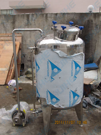 開放式發(fā)酵罐:將經(jīng)過破碎、二氧化硫處理、成分調(diào)整或不調(diào)整的葡萄果漿,用泵送入開口式發(fā)酵桶(池)至桶容約4/5,留空位約1/5預(yù)防發(fā)酵時(shí)皮渣沖出桶外,最好在一天內(nèi)沖齊。加入培養(yǎng)正旺盛的酒母3-5%乃至10%(按果漿量計(jì)),根據(jù)具體情況而定。