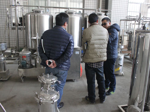 2015年3月2日,河南客戶自主創(chuàng)業(yè)需要采購(gòu)一套豆?jié){生產(chǎn)線設(shè)備,來(lái)我公司考察并與業(yè)務(wù)員進(jìn)行具體需求的洽談。下圖為業(yè)務(wù)員向客戶講解工廠設(shè)備: