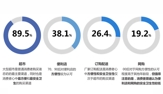 接近九成的消費者會選擇從超市購買液態(tài)奶,其次是便利店(38.1%)和訂購配送(26.4%),網(wǎng)購的比例更低,只有不到兩成。在消費者心中,超市也是“更方便”和“更安全衛(wèi)生”的購買渠道,其次是廠家訂購配送的渠道,僅有18.2%和13.7%的被訪消費者認為便利店和網(wǎng)購是“更方便”和“更安全衛(wèi)生”的購買渠道。