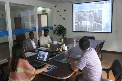非洲吉布提客戶需要訂制全套牛奶生產(chǎn)線設(shè)備,來(lái)我公司參觀并與銷售人員進(jìn)行具體細(xì)節(jié)的洽談。